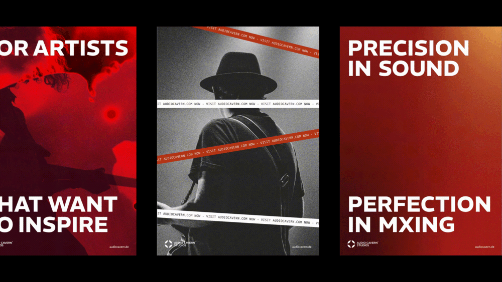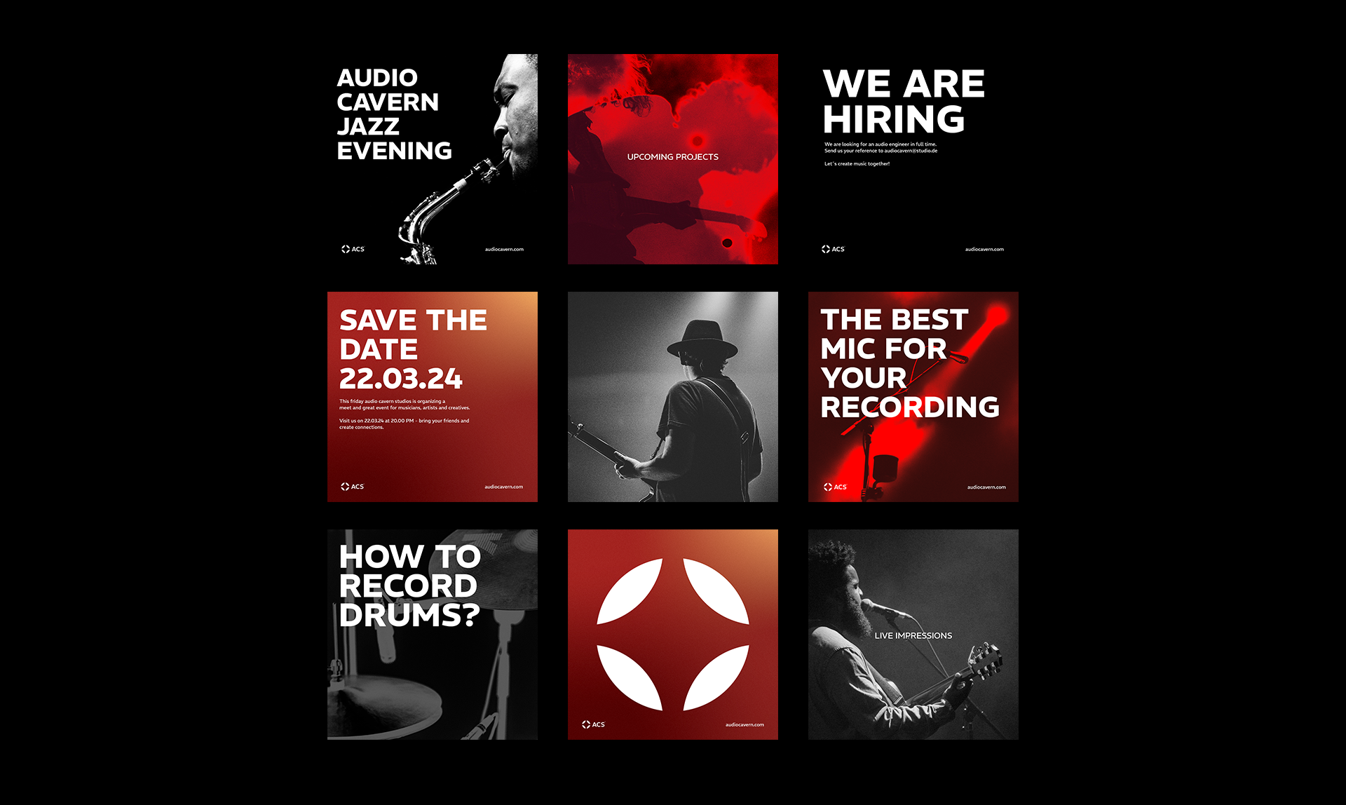 A brand identity that pulses with energy, crafted for a music recording studio where sound and design collide. Audio Cavern Studios merges a bold red color scheme with a raw, unfiltered aesthetic—wild yet undeniably classic.
